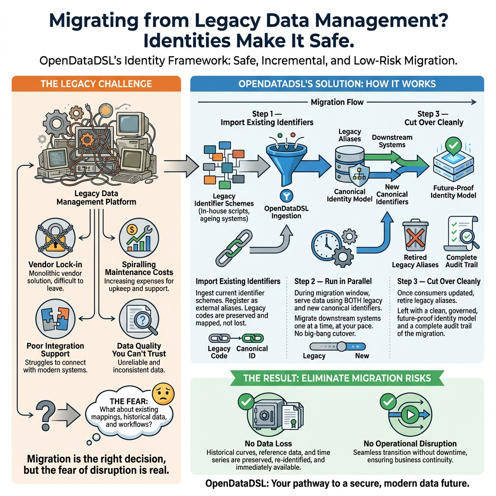 Step 2: Run in parallel. During your migration window, OpenDataDSL can serve data using both your legacy identifiers and the new canonical ones. Your downstream systems, including your ETRM, can be migrated one at a time, at your pace, without a big-bang cutover.